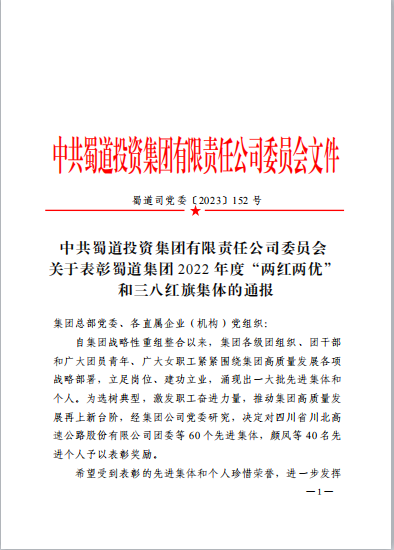 為選樹典型,激發(fā)職工奮進力量,推動蜀道集團高質量發(fā)展再上新臺階,4月17日,蜀道集團黨委印發(fā)《關于表彰蜀道集團2022年度“兩紅兩優(yōu)”和三八紅旗集體的通報》,敘古公司機關團支部榮獲榮獲五四紅旗團支部稱號。