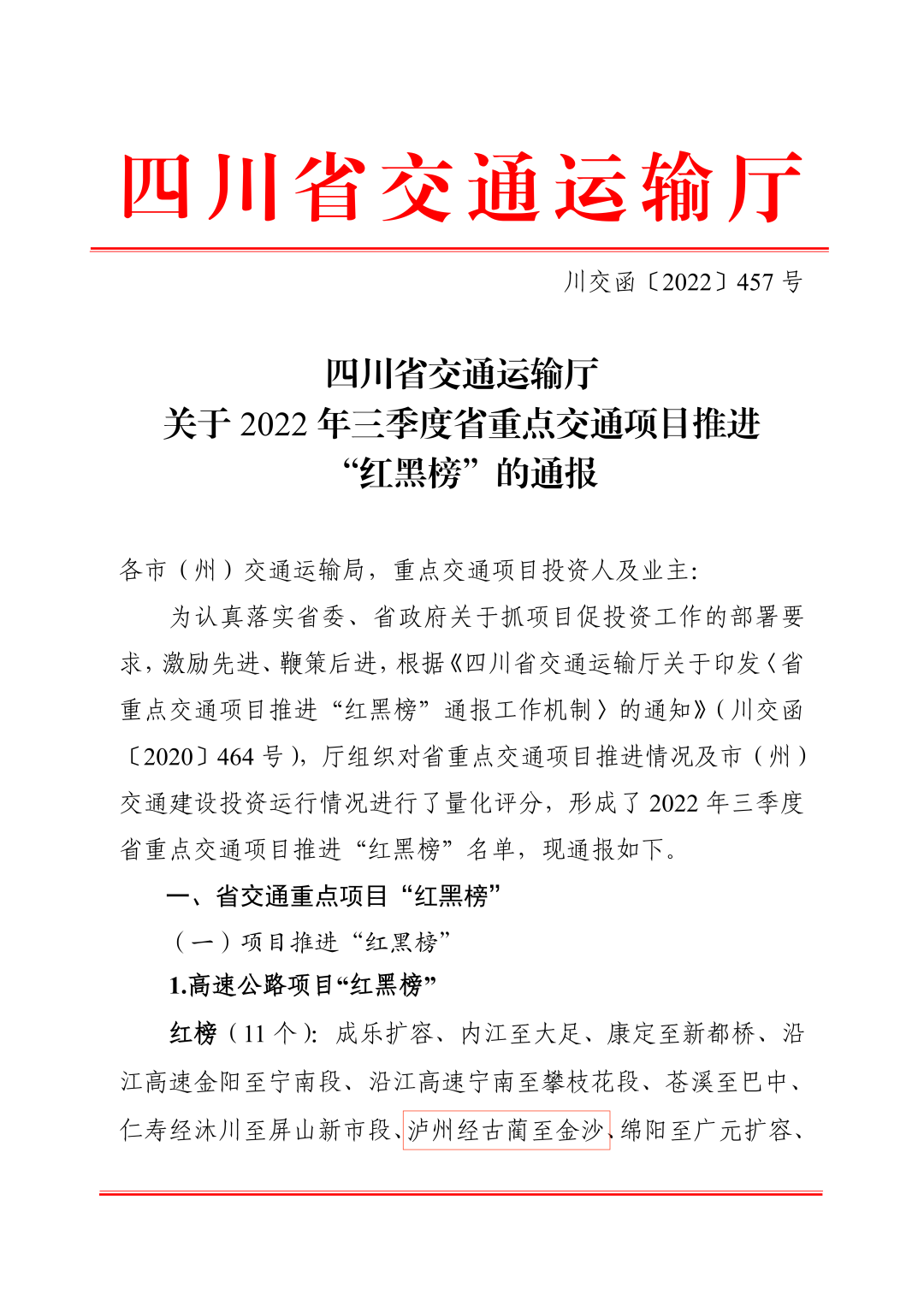 10月19日,四川省交通運輸廳發布《關于2022年三季度省重點交通項目推進“紅黑榜”的通報》(川交函〔2022〕457號),川黔公司投建的古金高速榮登省交通重點項目中高速公路項目推進“紅榜”。