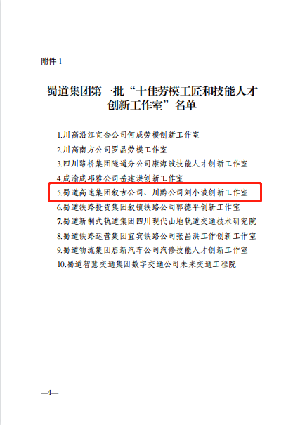 蜀道高速集團(tuán)敘古、川黔公司劉小波創(chuàng)新工作室榮獲蜀道集團(tuán)第一批“十佳勞模工匠和技能人才創(chuàng)新工作室”稱號