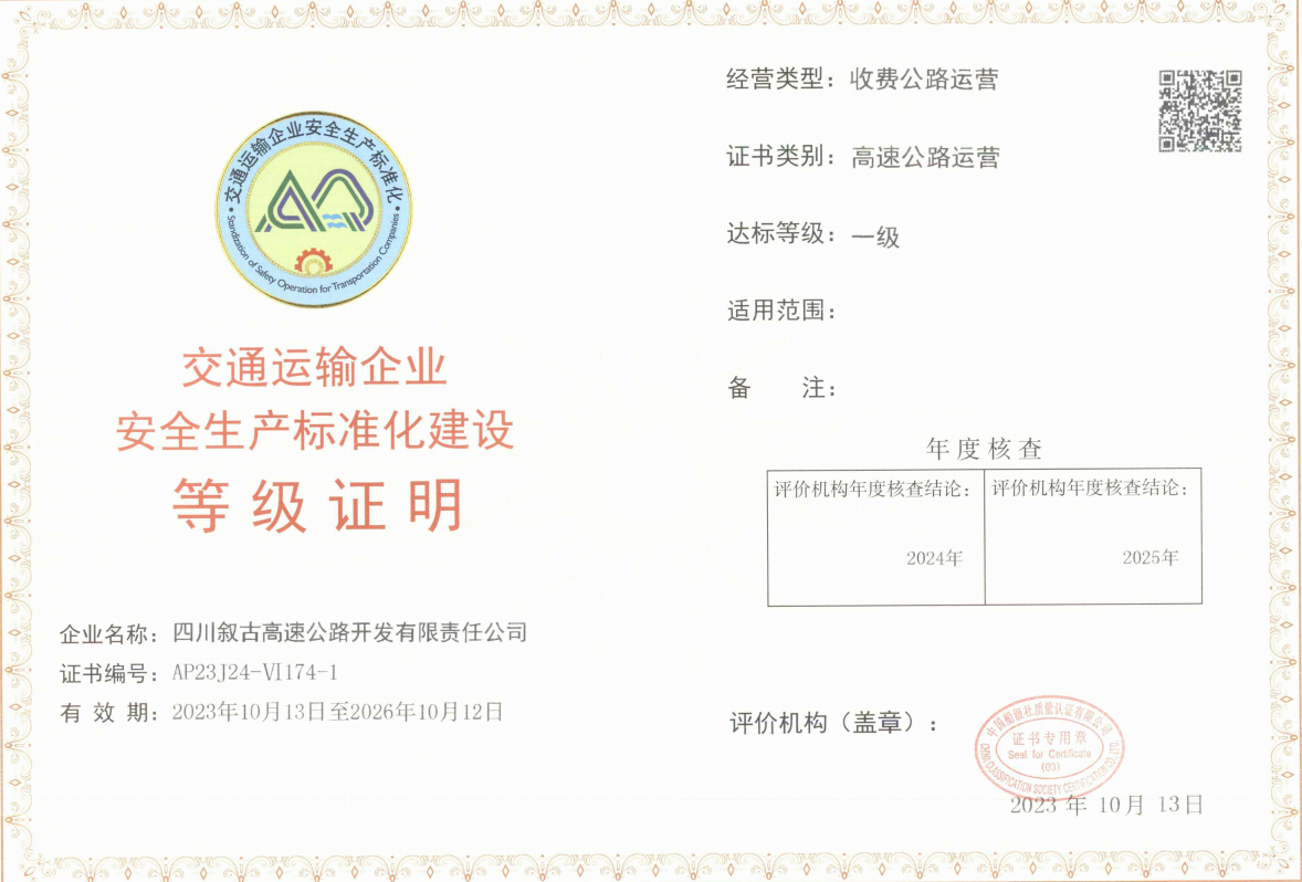 近日,敘古、敘威公司分別取得四川省交通運輸企業安全生產標準化一級企業達標證書,標志著敘古、敘威公司圓滿完成安全生產標準化一級達標創建目標任務,為公司安全生產工作再上新臺階奠定堅實基礎。