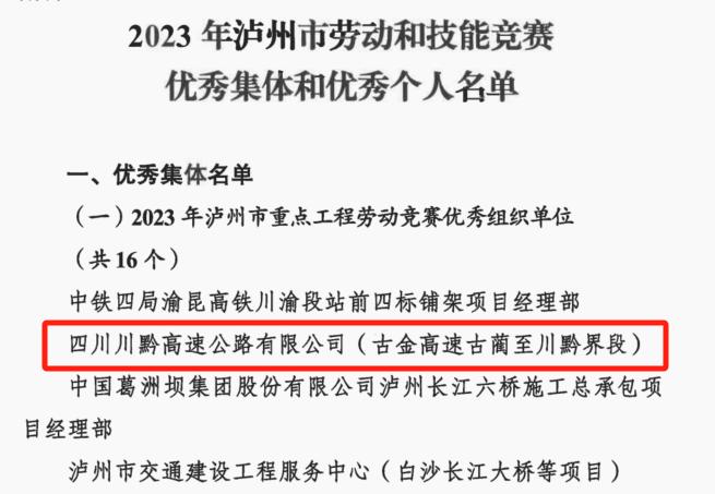 川黔公司榮獲2023年瀘州市重點工程勞動競賽優秀組織單位榮譽稱號
