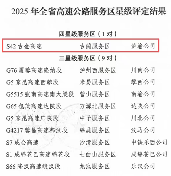 【喜報】古金高速古藺服務(wù)區(qū)成功斬獲2025年度四川省唯一“四星級服務(wù)區(qū)”榮譽(yù)稱號