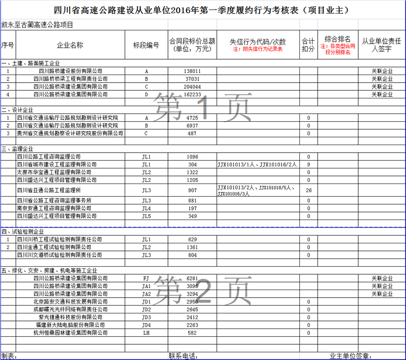 四川省高速公路建設從業單位2016年第一季度履約行為考核表