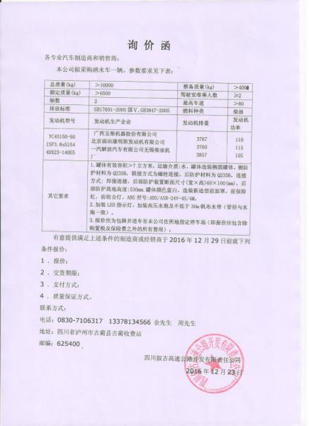 灑水車采購詢價函