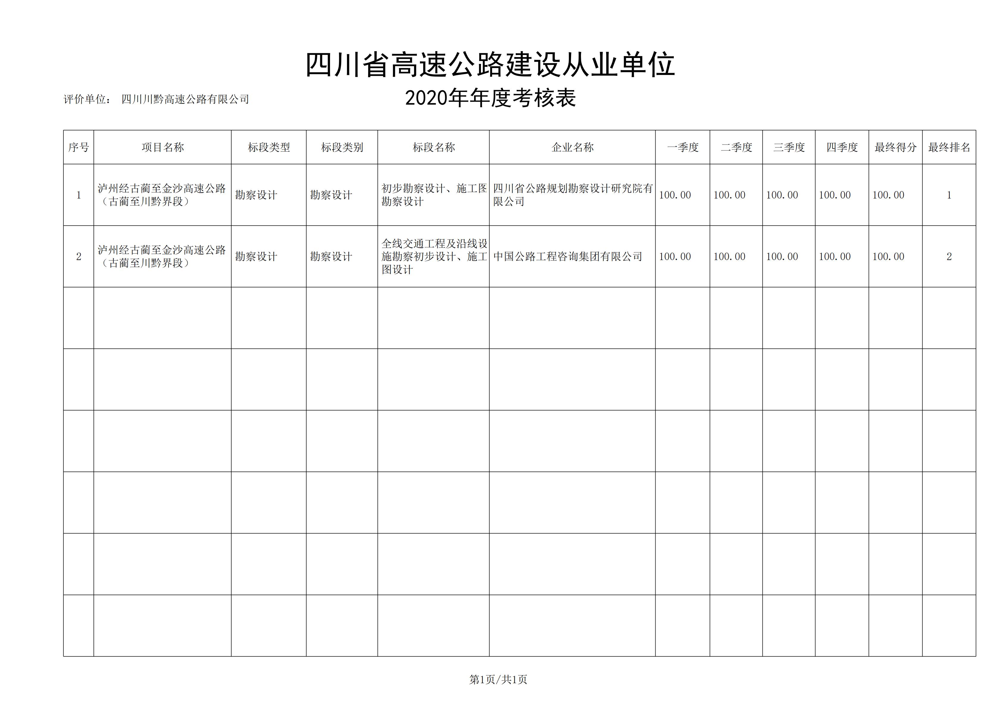 古金高速參建單位2020年信用評價公示