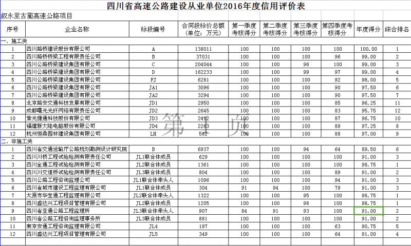 敘永至古藺高速公路從業(yè)單位2016年信用評價公示表