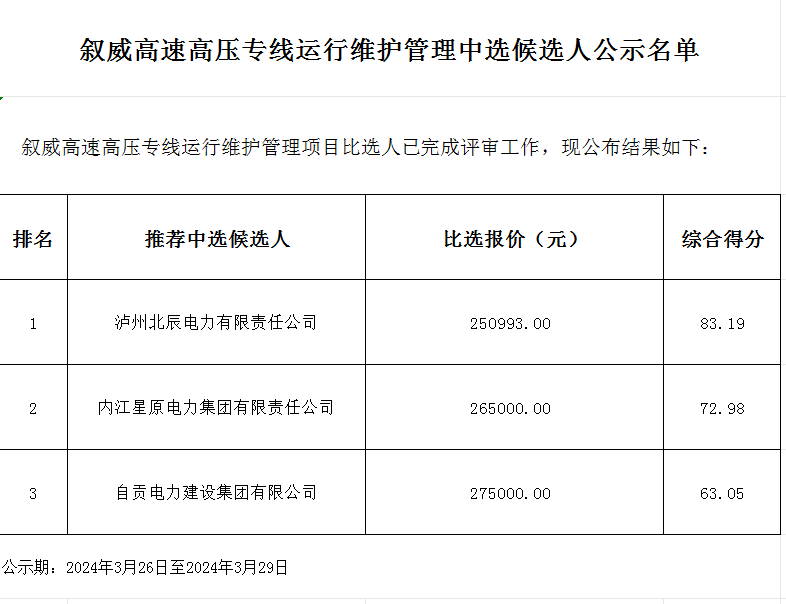 敘威高速高壓專線運行維護管理中選候選人公示名單