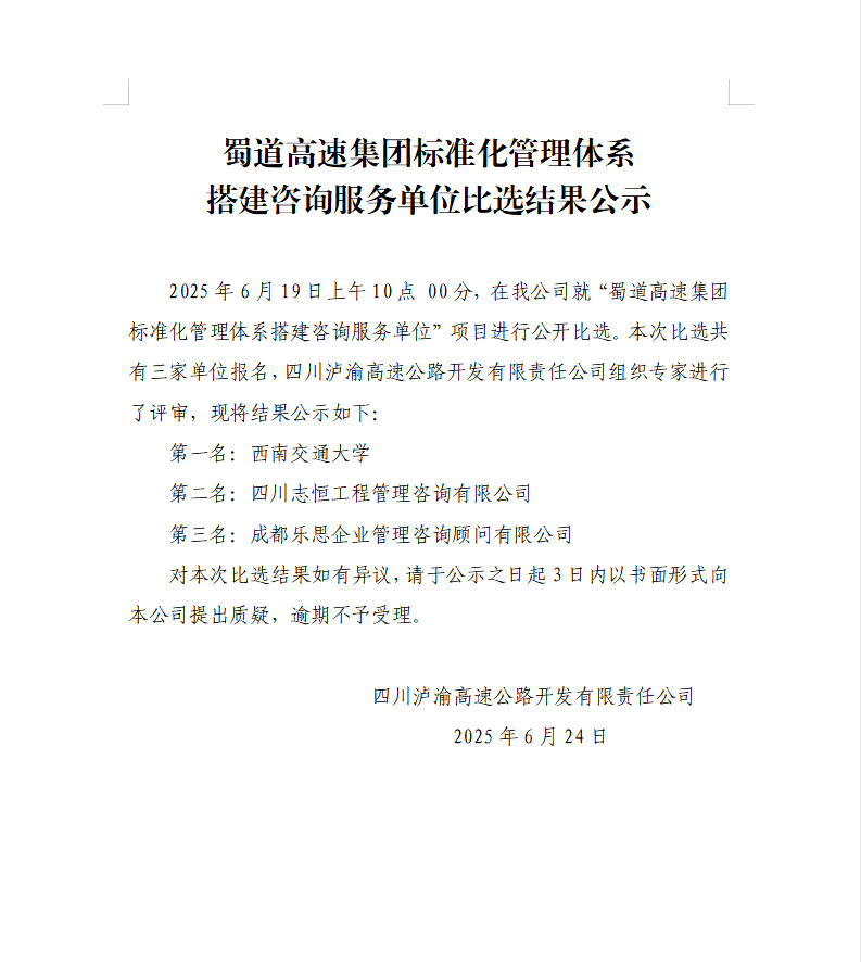 蜀道高速集團標準化管理體系搭建咨詢服務單位比選結果公示