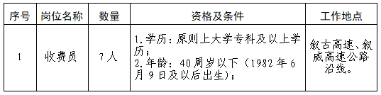 根據敘古敘威公司一線運營管理工作需要,擬面向蜀道集團系統開展收費崗位內部選聘工作?,F將相關事宜公告如下: