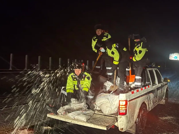 在接到雪情預警后,敘威高速路巡清障隊及時落實人員和機械,以雪為令、聞雪而動,采用人工拋灑融雪劑為主、機械清理鏟除較厚積雪為輔的方式,連夜開展除冰除雪保暢工作。截至目前,敘威高速路巡清障隊共出動23人次,出動機具12臺,出庫融雪劑22.45噸,撒布融雪劑6次,除冰除雪212公里。