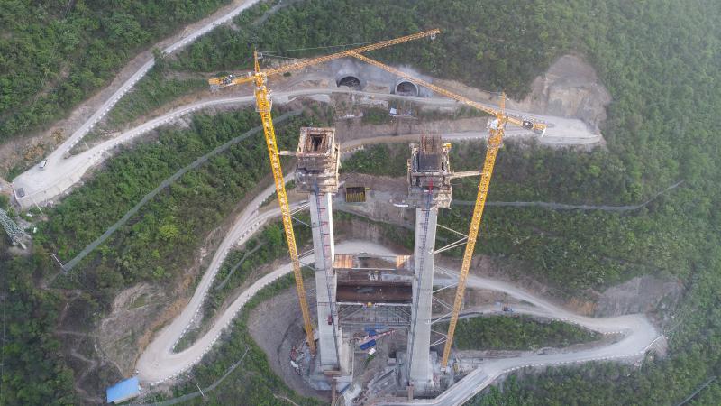 82年前,赤水之濱上演了一場“長征史上最光彩神奇的篇章”,82年后,一條承載著川黔兩地老區人民高速夢的神奇天路在此處正拔地而起。赤水河大橋主跨1200米,是世界上同類型橋梁中跨徑第二、主塔高度第二的峽谷鋼桁梁懸索大橋,該橋為325m+1200m+205m雙塔單跨吊鋼桁梁懸索橋,貴州岸錨碇為重力錨,四川岸錨碇為隧道錨。貴州岸引橋為2×30m+4×(4×40m)先簡支后結構連續T梁,四川岸引橋為3×33m現澆預應力混凝土箱梁。該橋梁樁基均采用人工成孔,主墩采用18根Ф3.5m大直徑樁基。該橋的主要工程特點為:大:大橋主跨1200米,是世界上同類型橋梁中跨徑第二、主塔高度第二的峽谷懸索大橋。難:一是超高索塔施工難(索塔最大高度243.5m);二是主梁吊裝難(采用1200m大跨徑的纜索吊裝工藝);三是地勢險要,施工運輸難。險:橋位地處50-75°近乎垂直的陡坡上,施工十分驚險。
