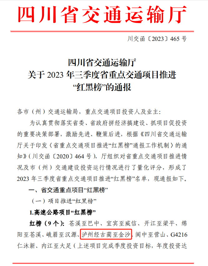 為認(rèn)真貫徹落實省委、省政府拼經(jīng)濟搞建設(shè)、抓項目促投資的重要決策部署,激勵先進、鞭策后進,近日,四川省交通運輸廳公布了2023 年三季度省重點交通項目推進“紅黑榜”名單,其中川黔公司投建古金高速榮登“紅榜”。