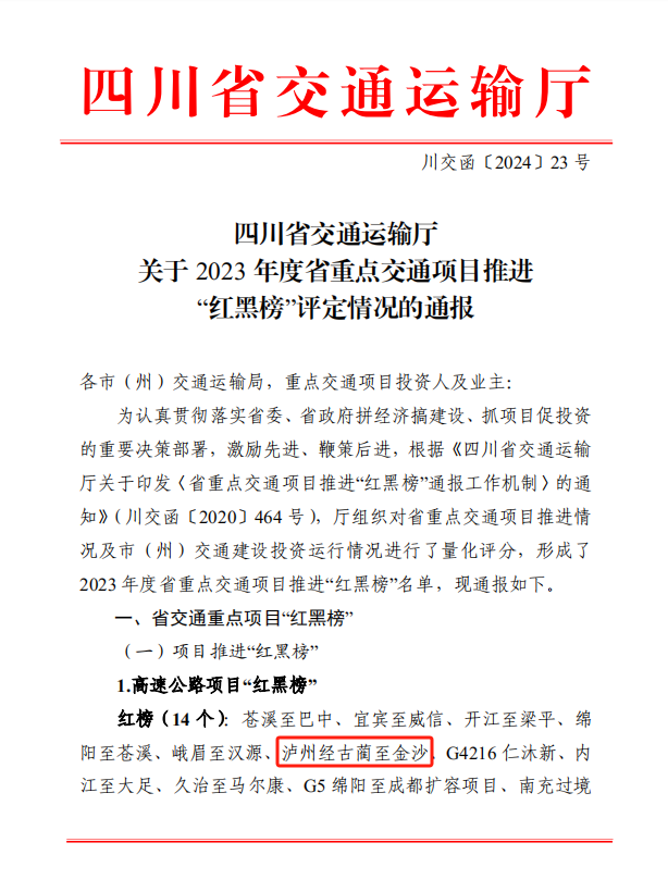 為認真貫徹落實省委、省政府拼經濟搞建設、抓項目促投資的重要決策部署,激勵先進、鞭策后進近日,四川省交通運輸廳針對省重點交通項目推進情況進行了量化評分,形成了2023年度省重點交通項目推進“紅黑榜”名單,古金高速榮登2023年度省重點交通項目推進“紅榜”。